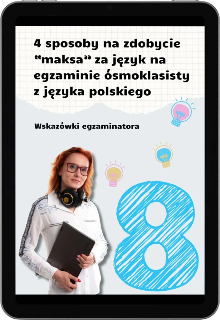 Do pakietu kursów z pisania dołączam cenny bonus – ebook Jak uzyskać „maksa” za język na e8”, w którym dzielę się konkretnymi wskazówkami, jak „podkręcić” język w wypracowaniu.