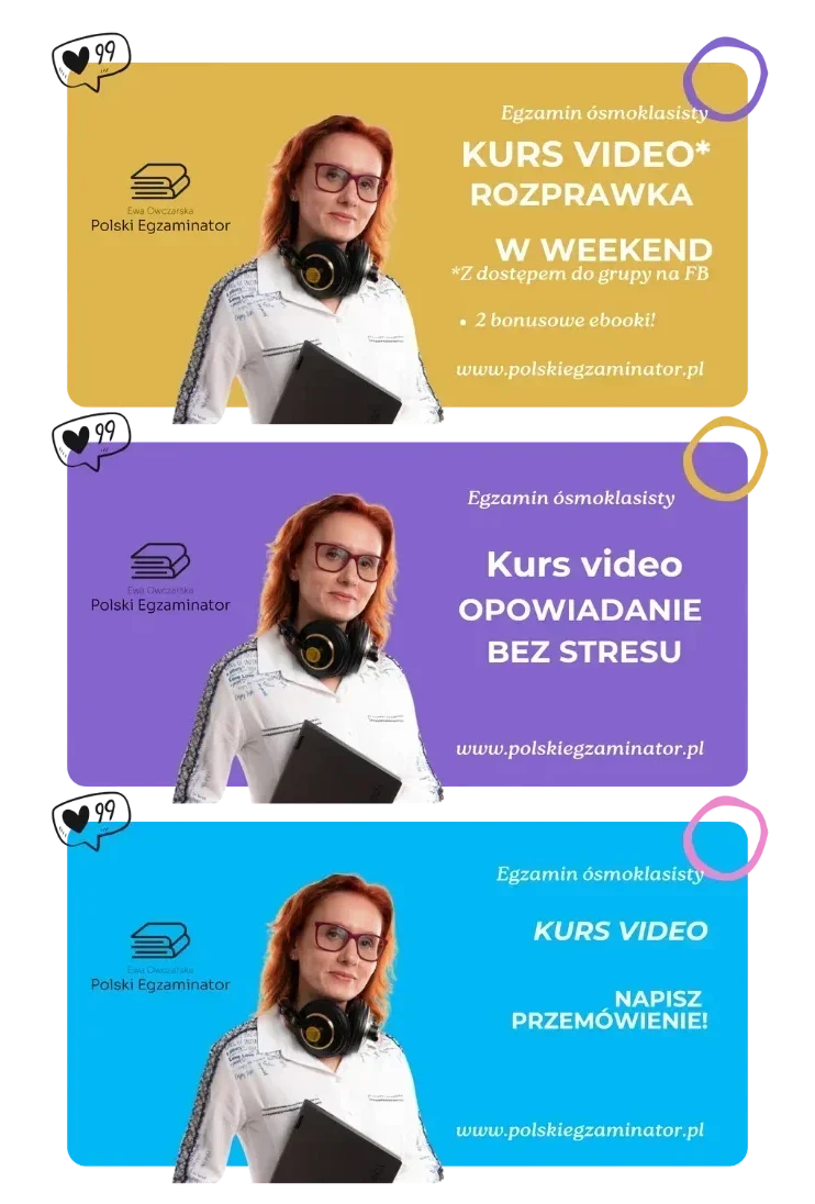 Kursy opracowane przez egzaminatorkę i polonistkę z dwudziestoletnim doświadczeniem w nauczaniu, na co dzień przygotowującej kolejne pokolenia ósmoklasistów do ich egzaminu!