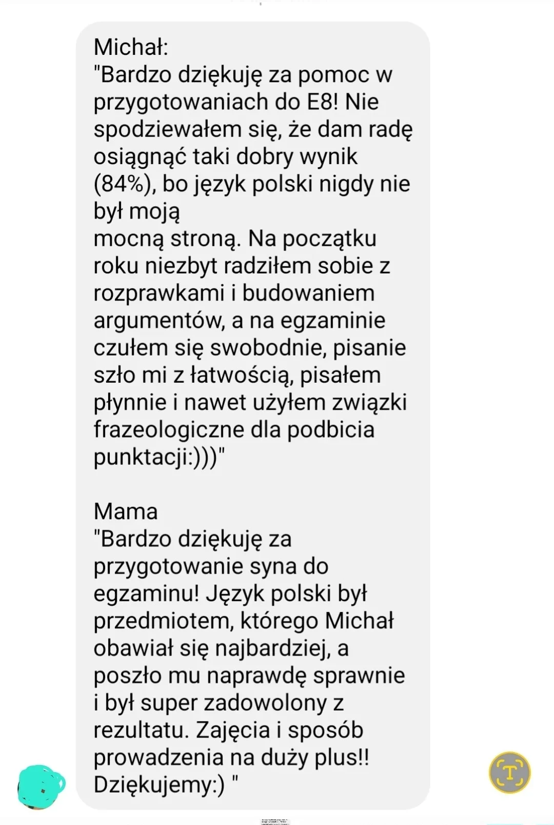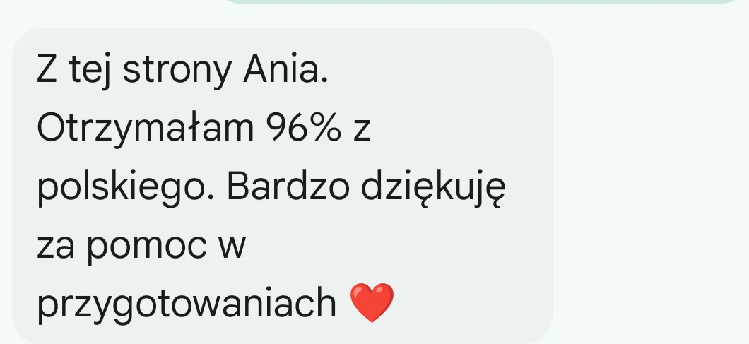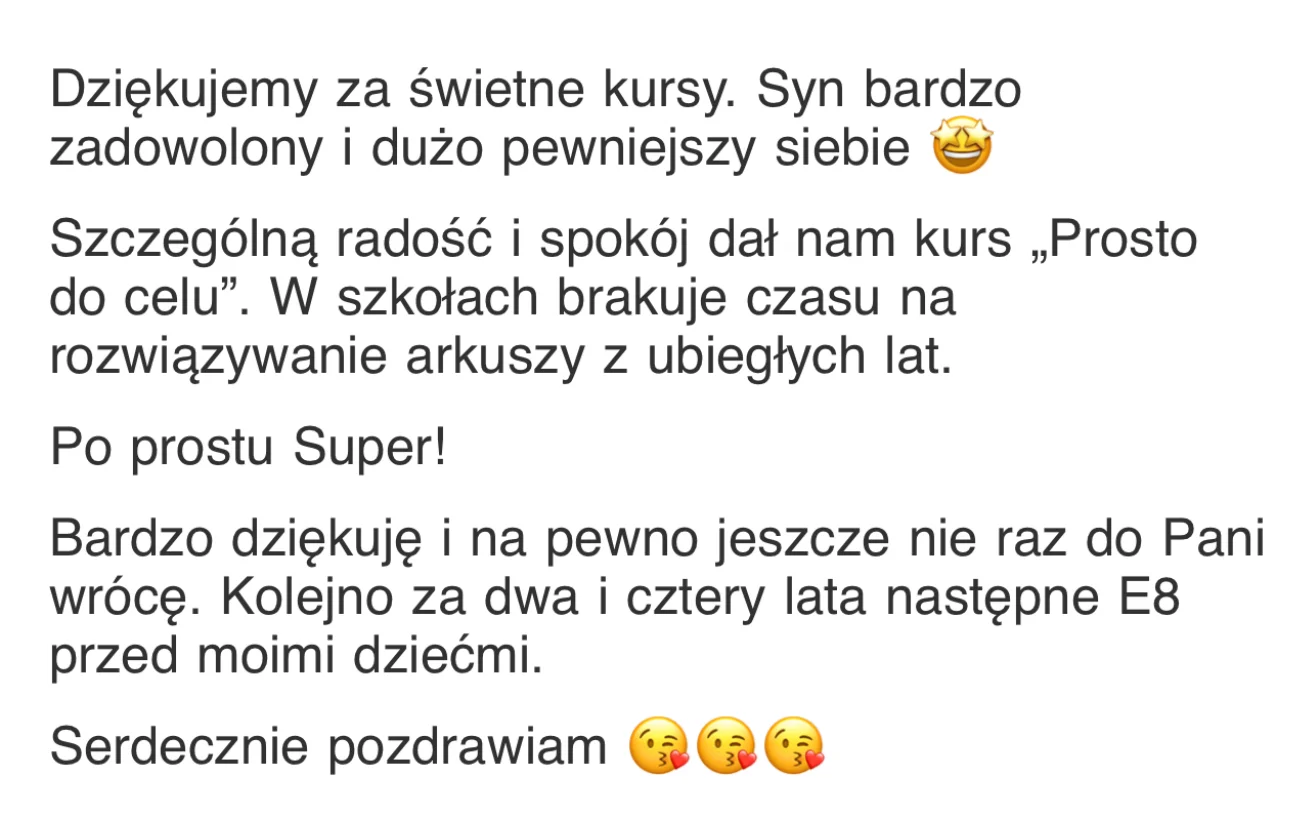 Chciałabym serdecznie podziękować za profesjonalną pomoc w przygotowaniu do egzaminu ósmoklasisty. Dzięki Pani Ewie, jej zaangażowaniu, cierpliwości oraz umiejętności przekazywania wiedzy, syn osiągnął wynik, który przerósł nasze oczekiwania. Z pełnym przekonaniem mogę polecić kurs Pani Ewy każdemu, kto szuka skutecznej pomocy w nauce. Jeszcze raz dziękuję za wspaniałą współpracę i owocne efekty. A.B.”