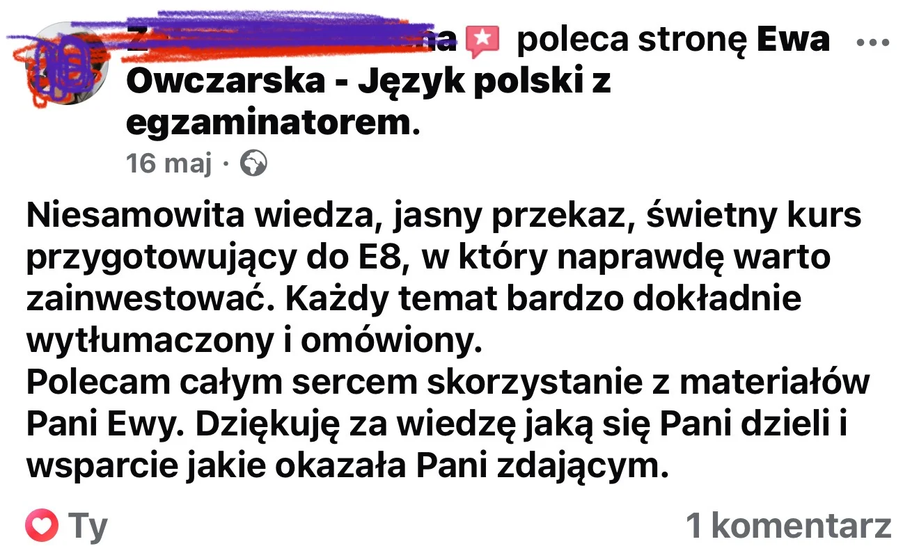 Polecam zajęcia z j. polskiego u pani Ewy Owczarskiej. Syn uczęszczał do pani Ewy na całoroczny kurs grupowy online przygotowujący do egzaminu ósmoklasisty. Zamysł kursu był świetnie przemyślany, i skupiał się dokładnie na tym co ósmoklasista powinien opanować, czyli solidna powtórka lektur, przerobienie mnóstwa arkuszy próbnych, a przede wszystkim trening pisania wypracowań. Pani Ewa ma fantastyczny kontakt z młodzieżą, potrafi w ciekawy sposób przekazywać wiedzę i motywować do pracy. Jako rodzic bardzo cenię współpracę z panią Ewą. Mogłam liczyć na jej pomoc w trakcie trwania kursu oraz również po egzaminach. Dodam jeszcze, że sama jestem nauczycielem z długim doświadczeniem i już od pierwszego kontaktu z Panią Ewą wiedziałam, że syn będzie w dobrych rękach.