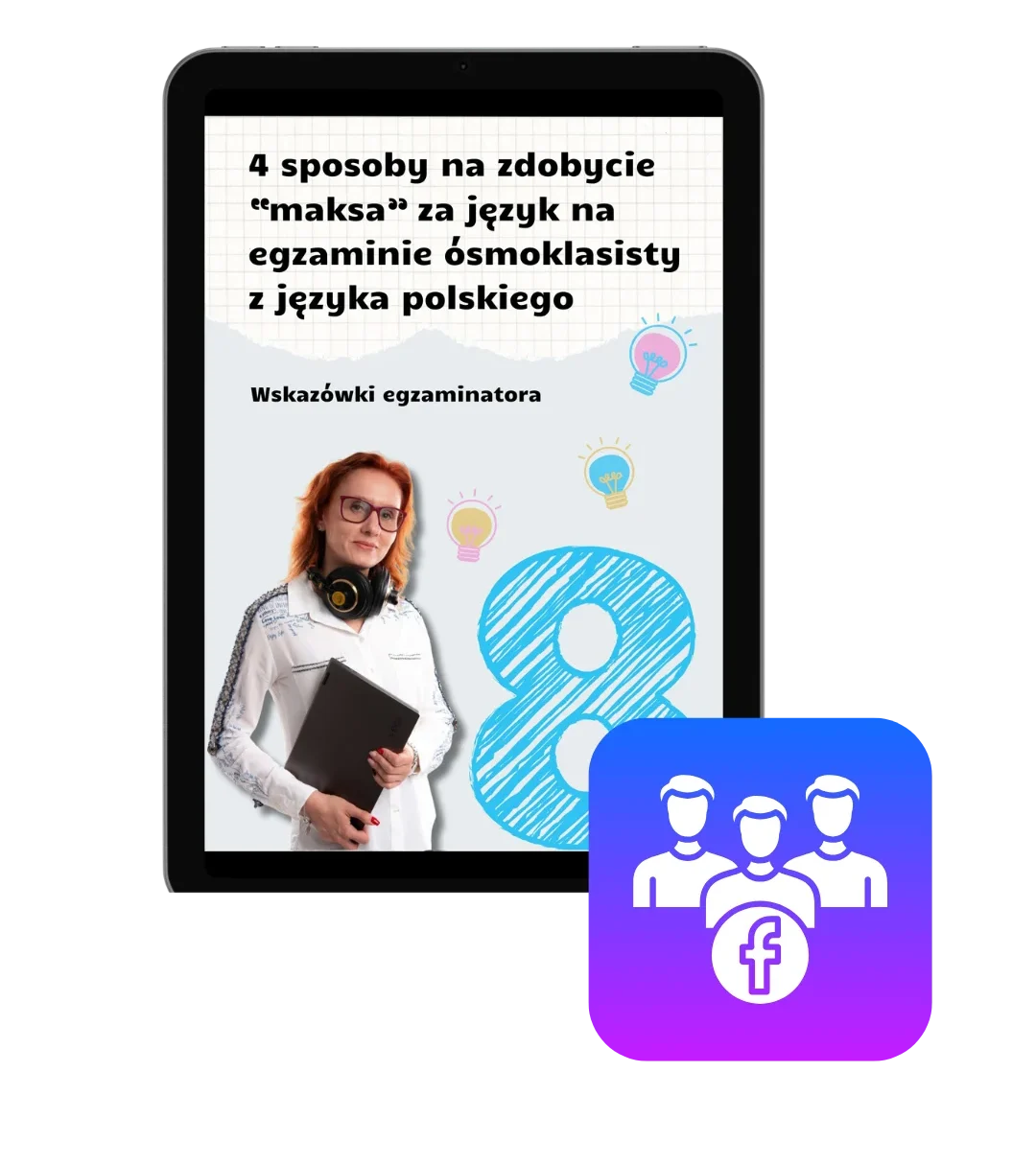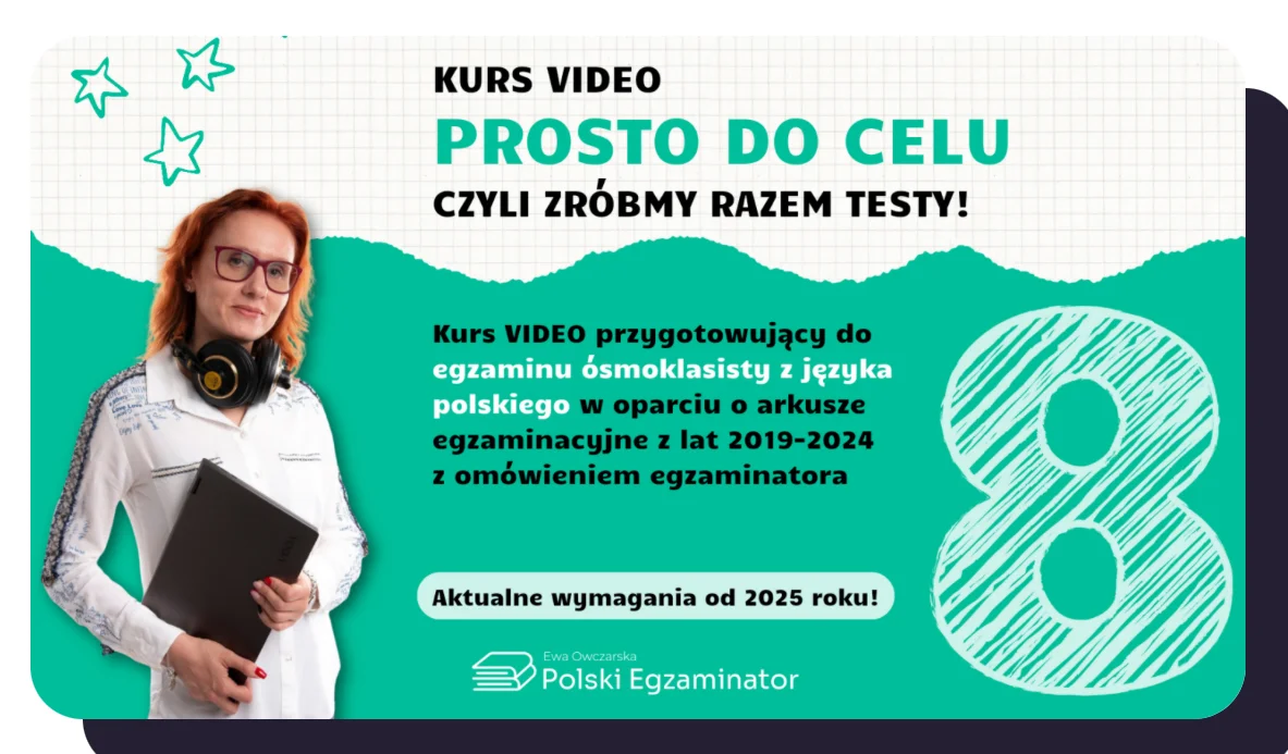Wraz z kursem „Prosto do celu – zróbmy razem testy” dostaniesz za 0 zł ebook: 4 sposoby na zdobycie „maksa” za język na egzaminie ósmoklasisty z języka polskiego o wartości 37 zł – dla Ciebie za 0 zł – tylko z tą ofertą!