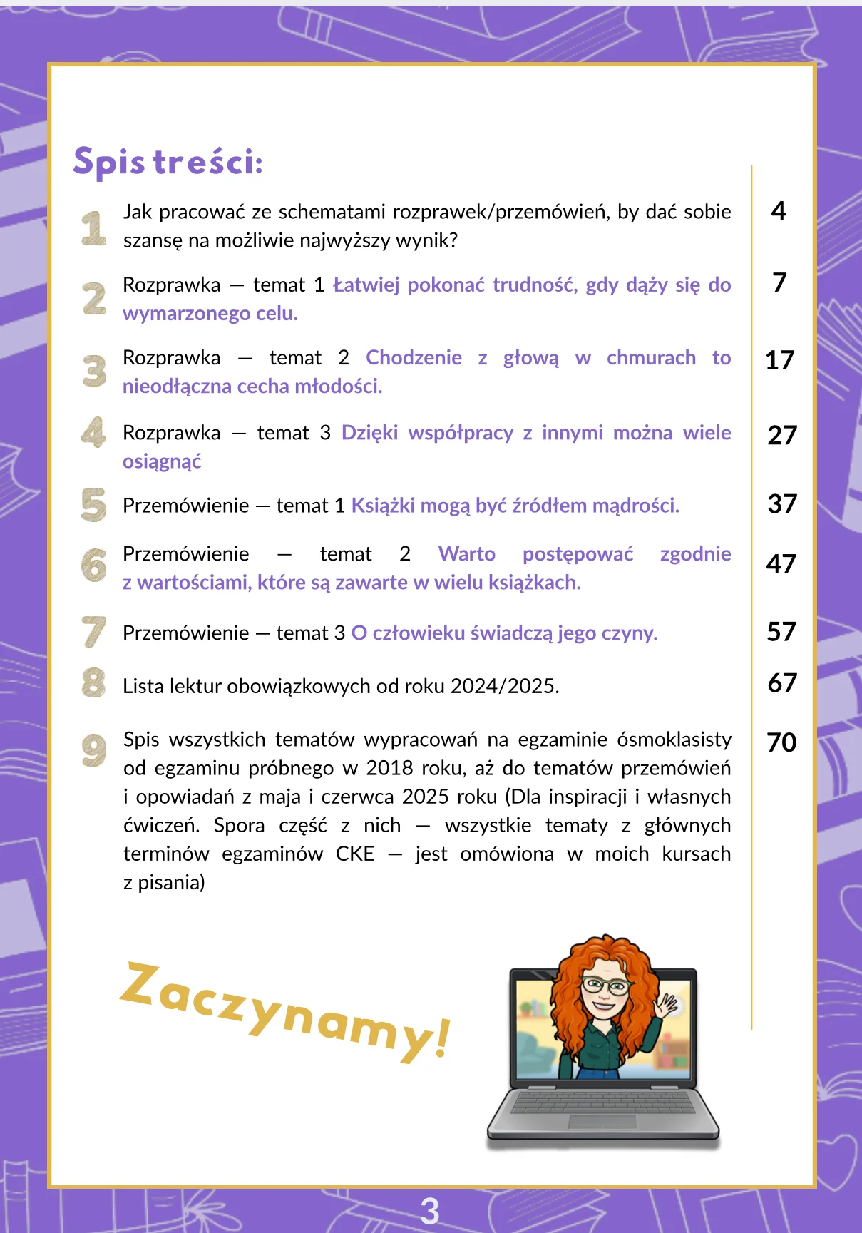 – Ponad 4 godziny nagranych live’ów, gdzie na żywo analizuję rozprawki z egzaminów próbnych oraz dodatkowych z lat 2019 – 2024!