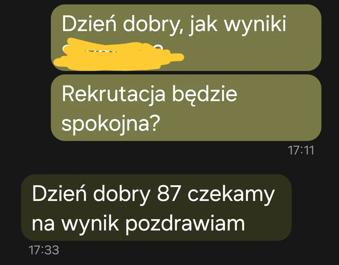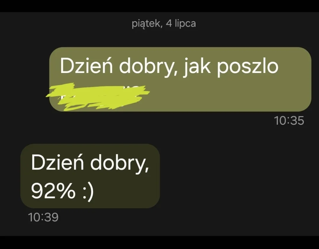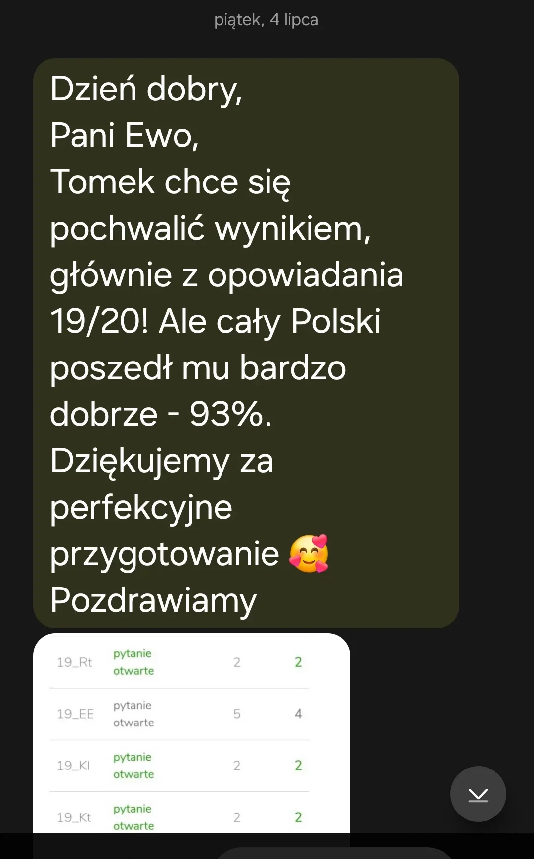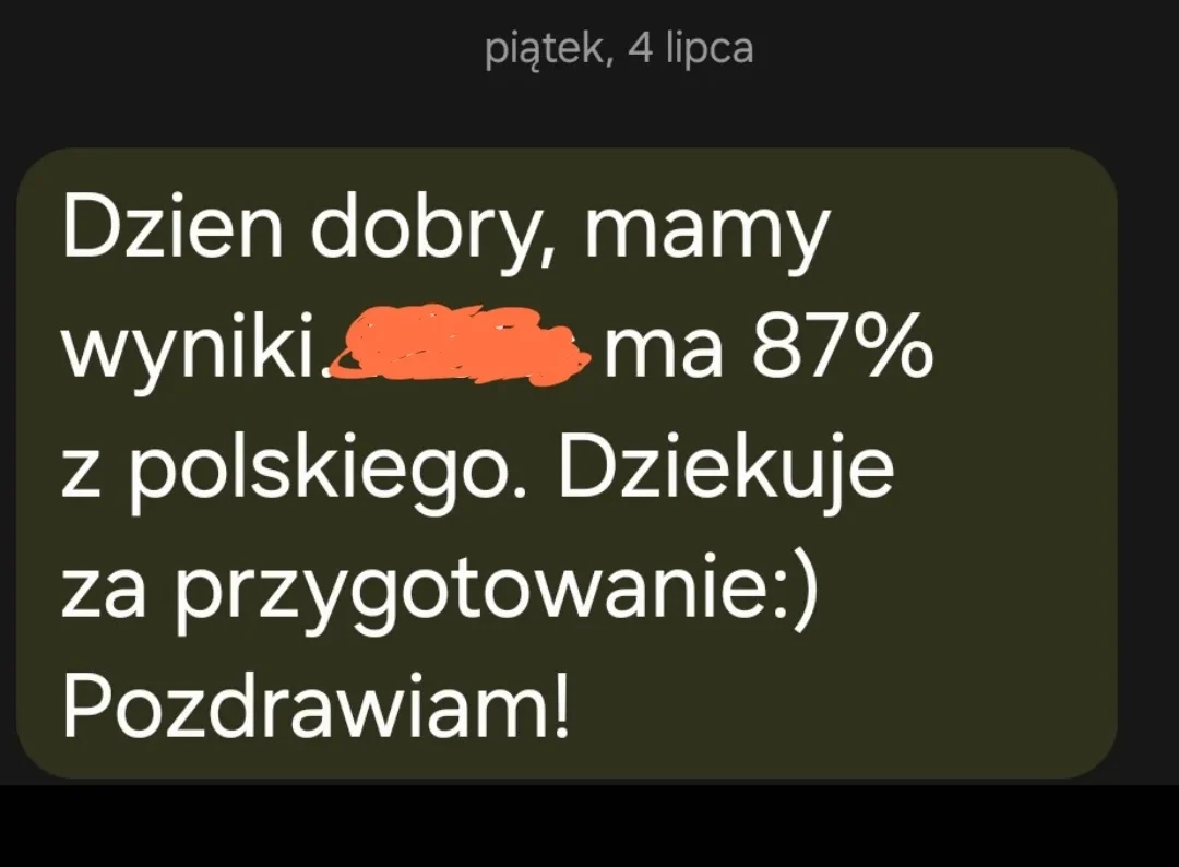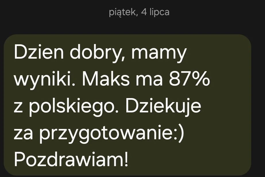 „Dzień dobry, Bartek miał 82 %. Jesteśmy bardzo zadowoleni, zwłaszcza że średnia szkoły jest na poziomie 77,21%. A. B.”